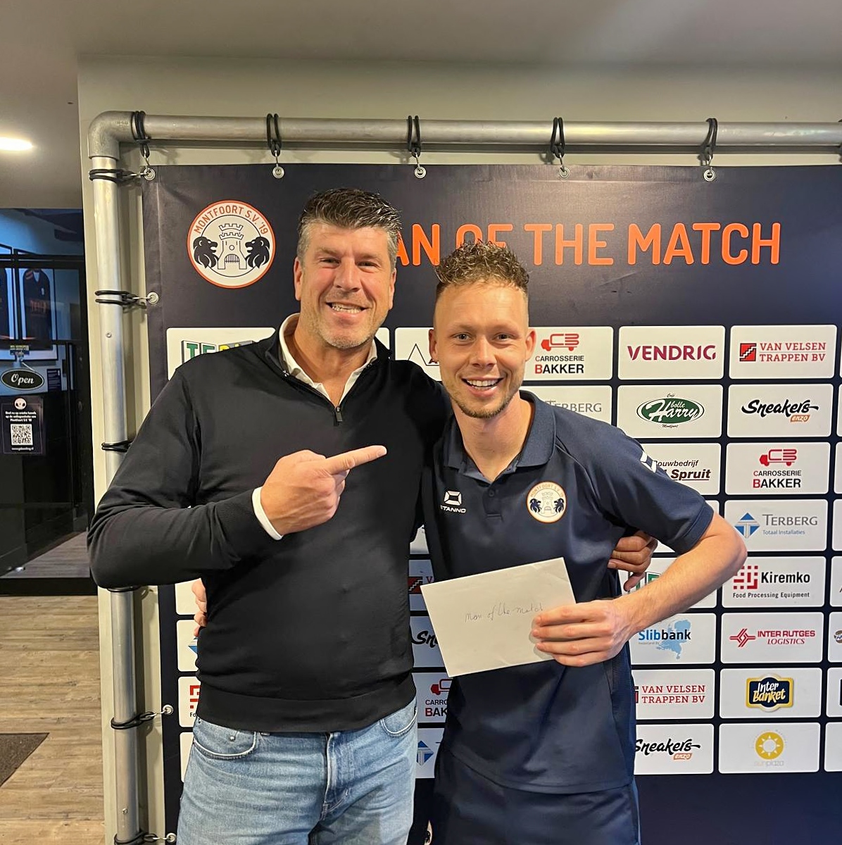 Alex Tersteeg, eigenaar van deze onderneming koos Mike van Oostrom als Man of the Match en kreeg de waardebonnen van Vlooswijk Fruit, Café Bolle Harry en sneakersenzo.nl overhandigd.