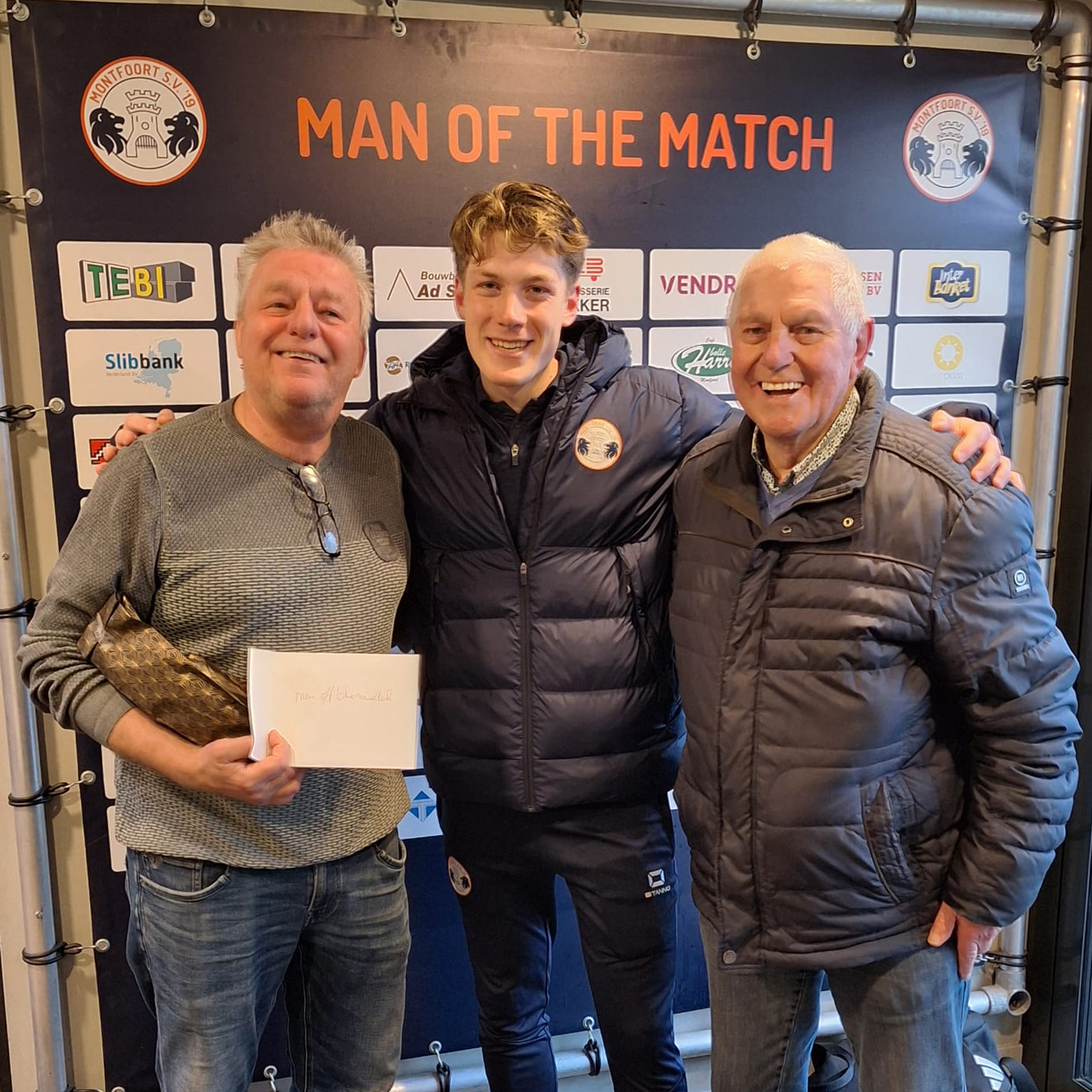 Eigenaar Wilfred van Schaik (links op de foto) en Koos van Schaik (rechts) kozen Wiek Drost als Man of the Match en hij kreeg de waardebonnen van Vlooswijk Fruit, Café Bolle Harry en sneakersenzo.nl overhandigd.